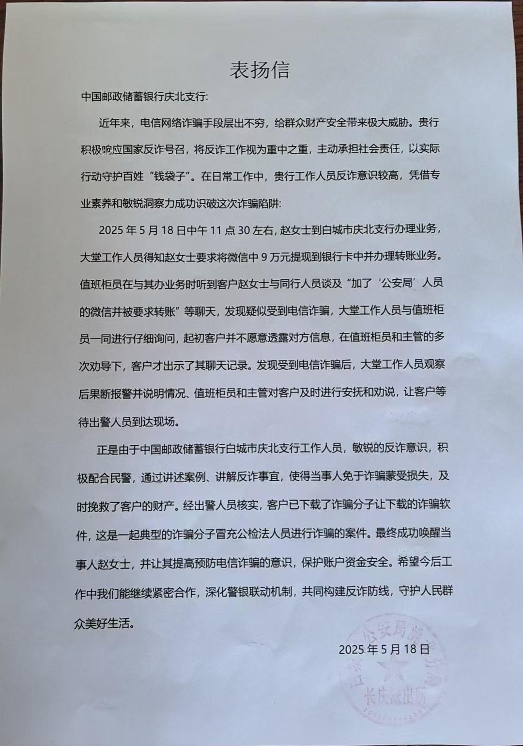 5月18日中午,白城市慶北支行工作人員憑借敏銳的風險意識和高效協作,成功攔截一起冒充公檢法人員的電信詐騙案件,為客戶趙阿姨挽回9萬元經濟損失,筑牢了金融安全防線。