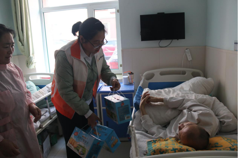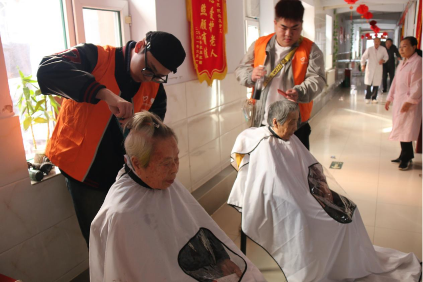 除了智慧助老教學,志愿者帶來的愛心剪發服務也成為活動中一抹溫馨的亮色。幾把剪刀、推子、梳子,組成了一個臨時卻專業的“陽光理發角”。志愿者們技藝嫻熟、服務周到,一邊為老人修剪頭發,一邊親切地與他們拉家常,關心他們的身體健康與生活近況。修剪的是發絲,傳遞的卻是如家人般的陪伴與牽掛。與此同時,另一隊志愿者走進室內,為失能老人送上牛奶、餅干等慰問品,將溫暖延伸到每一個角落。