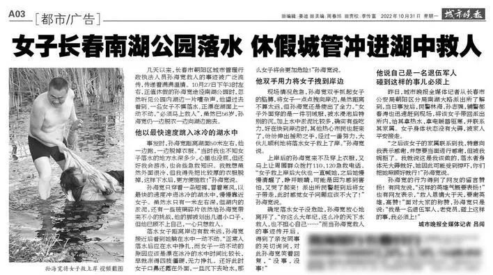 10月27日下午3時(shí)左右,正在休假期間的孫海寬忽然聽(tīng)見(jiàn)南湖公園西側(cè)岸邊一片嘈雜。他發(fā)現(xiàn)一名50多歲的女性正漂在湖邊,得知落水女子已困在水中近半小時(shí)了,10月末的晚秋氣溫接近零攝氏度,孫海寬雖已56歲,但當(dāng)時(shí)情況緊急,他來(lái)不及多加考慮,立即脫下衣物,冒著寒風(fēng)跳進(jìn)刺骨的湖水中。