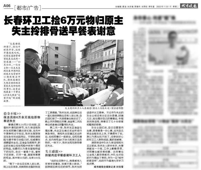 10月27日,失主與湖西保潔中隊(duì)取得聯(lián)系,張慶友也主動(dòng)向上級(jí)部門(mén)說(shuō)明了情況,失主丟失的6萬(wàn)元現(xiàn)金失而復(fù)得。隨后,失主現(xiàn)場(chǎng)拿出部分現(xiàn)金表示感謝,但被張慶友婉拒。