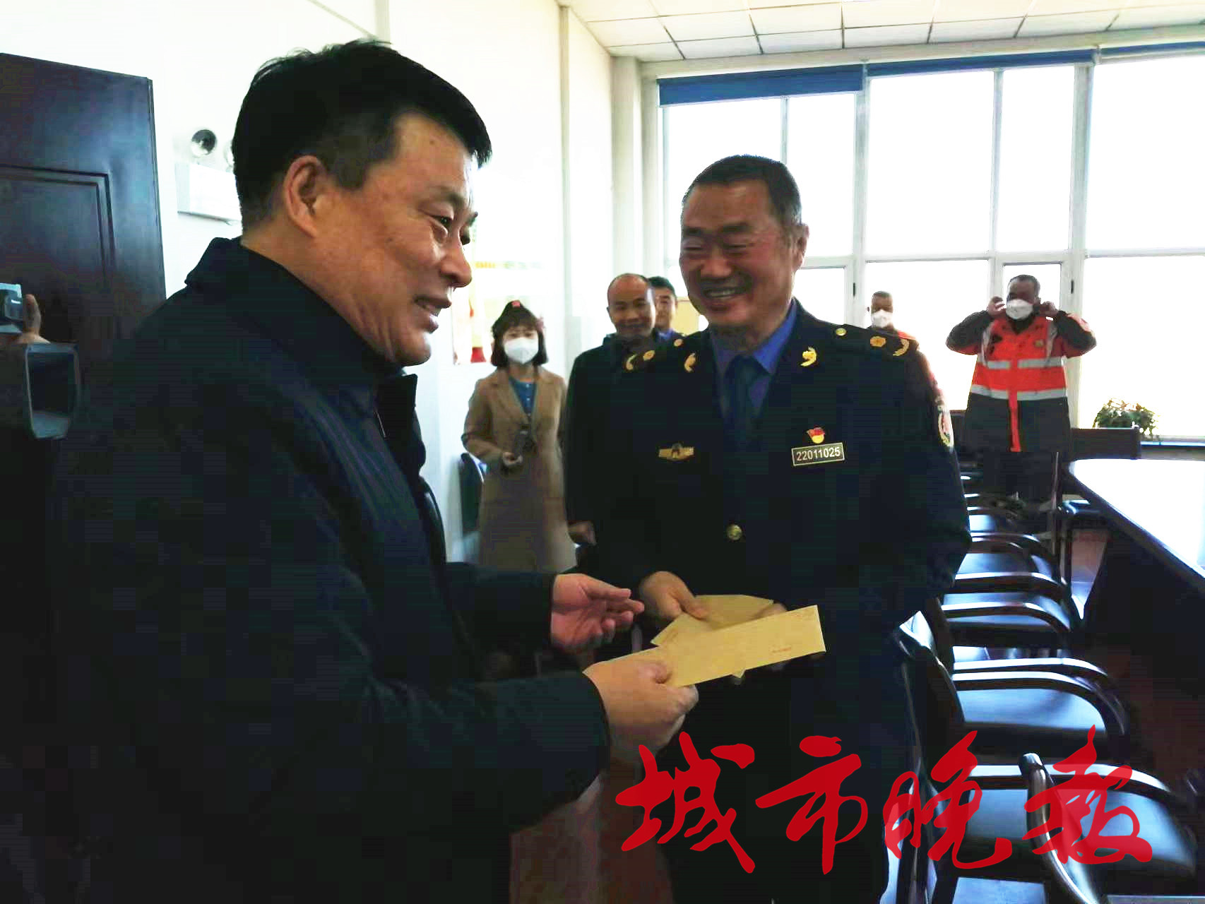 近日,長(zhǎng)春市朝陽(yáng)區(qū)城市管理行政執(zhí)法局綜合執(zhí)法科工作人員孫海寬、朝陽(yáng)區(qū)環(huán)境衛(wèi)生管理中心湖西保潔中隊(duì)保潔員張慶友用“見(jiàn)義勇為”“拾金不昧”的實(shí)際行動(dòng)給出了答案。 孫海寬在冰冷的湖中勇救落水人員,張慶友把6萬(wàn)余元現(xiàn)金“物歸原主”,他們的故事不僅在社會(huì)上弘揚(yáng)了滿滿的正能量,也感動(dòng)了無(wú)數(shù)的長(zhǎng)春人。 11月1日,長(zhǎng)春市城市管理局黨組書(shū)記、局長(zhǎng)王世忠看望了“見(jiàn)義勇為”的行政執(zhí)法人員孫海寬、“拾金不昧”的保潔員張慶友,并發(fā)放慰問(wèn)品、慰問(wèn)金。