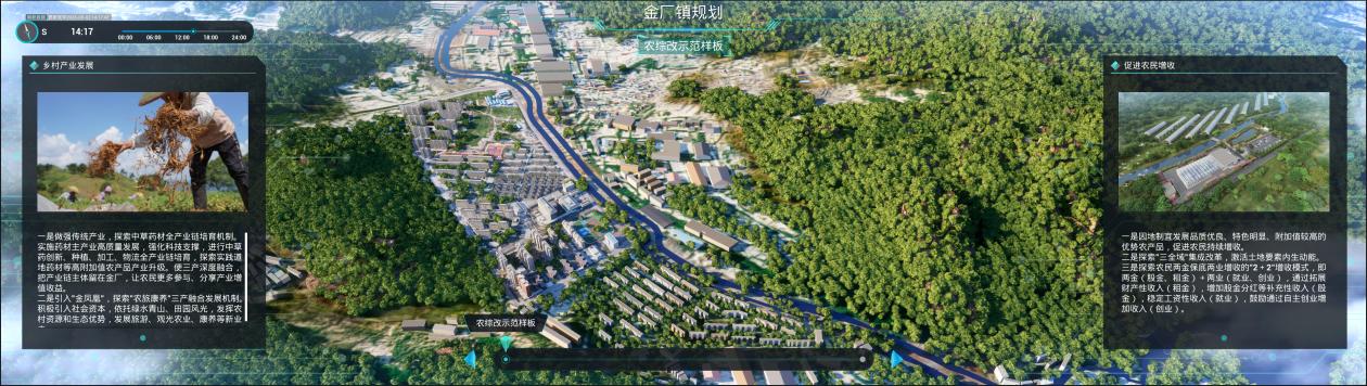步入金廠鎮(zhèn)政府指揮中心,首先映入眼簾的是一座直觀展現(xiàn)金廠鎮(zhèn)全貌的數(shù)字沙盤。沙盤后方的大數(shù)據(jù)智慧管理平臺上呈現(xiàn)著山、水、林、田、湖、草、建筑物、街巷等金廠鎮(zhèn)數(shù)字孿生場景,鎮(zhèn)內(nèi)各區(qū)域規(guī)劃建設(shè)的基本情況、示范藥田監(jiān)測數(shù)據(jù)、政務(wù)服務(wù)情況、平安鄉(xiāng)村監(jiān)控視頻等功能板塊清晰可見,輔助鎮(zhèn)政府高效進(jìn)行“一張圖”全域規(guī)劃和“一盤棋”城鎮(zhèn)治理。